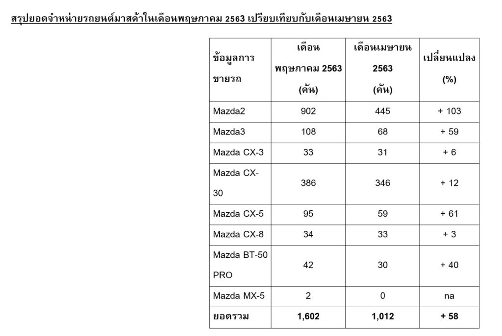 ส่งผลให้ยอดขายในเดือนพฤษภาคมที่ผ่านมาเติบโตเพิ่มขึ้นถึง 58% เมื่อเทียบกับยอดขายของเดือนเมษายน ด้วยยอดรวมทั้งสิ้น 1,602 คัน โดยรุ่นที่ทำยอดขายมากที่สุดยังคงเป็น Mazda2 จำนวน 902 คัน ตามมาด้วย CX-30 จำนวน 386 คัน, Mazda3 จำนวน 108 คัน, CX-5 จำนวน 95 คัน, BT-50 PRO จำนวน 42 คัน, CX-8 จำนวน 34 คัน, CX-3 จำนวน 33 คัน และ MX-5 จำนวน 2 คัน