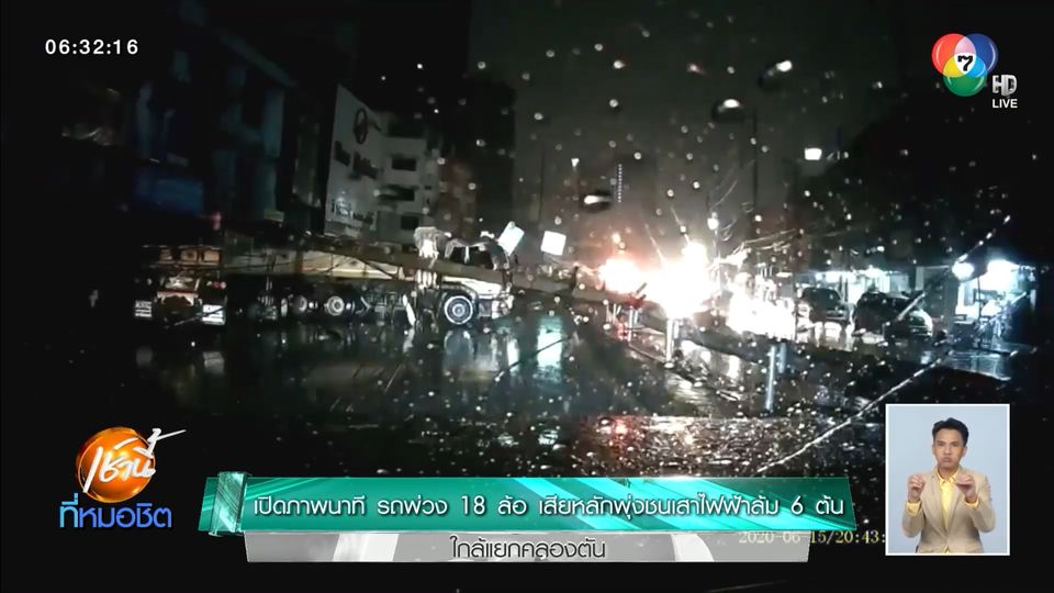 เปิดภาพนาที รถพ่วง 18 ล้อ เสียหลักพุ่งชนเสาไฟฟ้าล้ม 6 ต้น ใกล้แยกคลองตัน - ช่อง 7