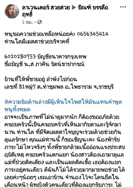 ล่าสุดกำลังจะถูกยึดบ้านในสิ้นเดือนส.ค.นี้ ทำให้ทั้งหมดจะไม่มีบ้านอยู่ จึงประกาศขายร้านเสริมสวยที่เปิดไว้ เตรียมหาเงินไว้รักษาแม่และพี่ชายพร้อมหาที่อยู่ใหม่ให้ทั้งคู่ ตอนนี้ทำได้แค่รอความหวังปาฏิหาริย์ว่าบ้านจะไม่ถูกยึด ก่อนหน้านี้เคยร้องขอความช่วยเหลือไปหลายหน่วยงาน แต่ไม่ได้รับการช่วยเหลือ จึงมาโพสต์ขอความช่วยเหลือทางเพจ "บิณฑ์ บรรลือฤทธิ์" แต่กลับถูกหนุ่มแอบอ้างซี้พี่บิณฑ์ หลอกทำเอกสารรับรองเงินเดือนกู้เงินใช้หนี้ อ้างพี่บิณฑ์เรียกพบให้การช่วยเหลือ สุดท้ายติดต่อไม่ได้