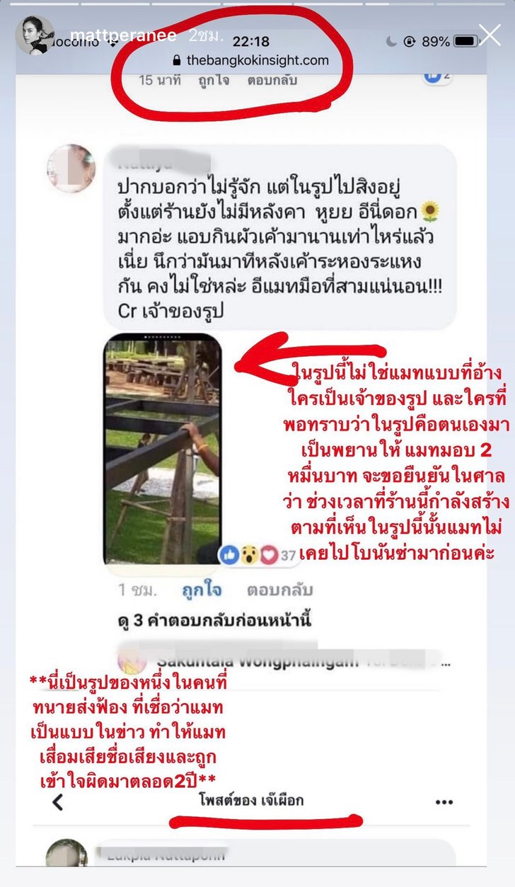 ตามข้อความที่แมทเขียนในสตอรี่ว่า "ในรูปนี้ไม่ใช่แมทแบบที่อ้าง ใครเป็นเจ้าของรูปและใครที่พอทราบว่าในรูปคือตนเองมาเป็นพยานให้ แมทมอบ 2 หมื่นบาท จะขอยืนยันในศาลว่าช่วงเวลาที่ร้านนี้กำลังสร้างตามที่เห็นในรูปนี้นั้นแมทไม่เคยไปโบนันซ่ามาก่อนค่ะ