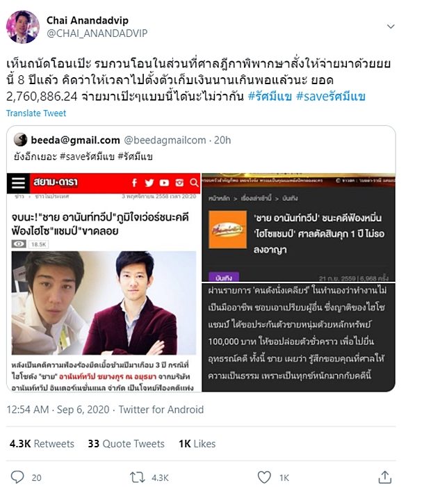 ล่าสุด ชาย อานันท์ทวีป ชยางกูร ณ อยุธยา เพื่อนสนิทของซุปตาร์สาว อั้ม-พัชราภา ได้ทวีตข้อความถึง ไฮโซแชมป์ พร้อมติดแฮชแท็ก รัศมีแข #saveรัศมีแข โดยระบุว่า "เห็นถนัดโอนเป๊ะ รบกวนโอนในส่วนที่ศาลฎีกาพิพากษาสั่งให้จ่ายมาด้วย นี้ 8 ปีแล้ว คิดว่าให้เวลาไปตั้งตัวเก็บเงินนานเกินพอแล้วนะ ยอด 2,760,886.24 จ่ายมาเป๊ะๆแบบนี้ได้นะไม่ว่ากัน #รัศมีแข #saveรัศมีแข" พร้อมทั้งแนบคดีที่เคยเกิดขึ้นระหว่างตนเองและไฮโซแชมป์ ที่ฟ้องร้องกันก่อนหน้านี้