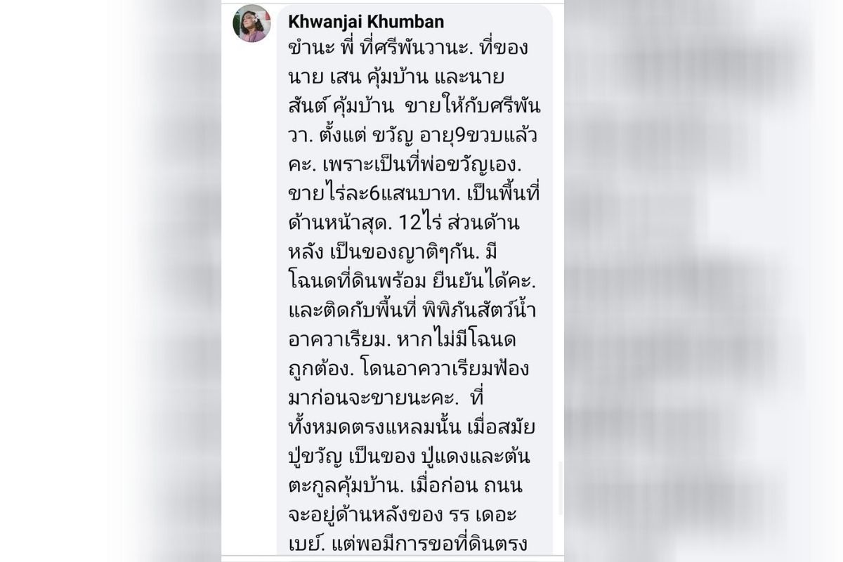 “ขำนะ พี่ ที่ศรีพันวานะ ที่ของนายเสน คุ้มบ้าน และนายสันต์ คุ้มบ้าน ขายให้กับศรีพันวา ตั้งแต่ ขวัญ อายุ 9 ขวบแล้วคะ เพราะเป็นที่พ่อขวัญเอง ขายไร่ละ 6 แสนบาท เป็นพื้นที่ด้านหน้าสุด 12 ไร่ ส่วนด้านหลัง เป็นของญาติๆ กัน มีโฉนดที่ดินพร้อม ยืนยันได้คะ และติดกับพื้นที่ พิพิภันสัตว์น้ำ อาควาเรียมหากไม่มีโฉนดถูกต้อง โดนอาควาเรียมฟ้องมาก่อนจะขายนะคะ” ผู้ใช้งานชื่อ Khwanjai Khumban เขียนผ่านเฟซบุ๊ก
