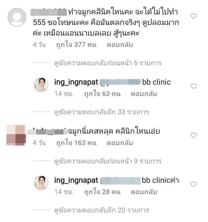 รวมถึงหลายคอมเมนต์อิงอิงก็มีการตอบชาวเน็ตกลับด้วย แต่ที่แซ่บสุดคงจะเป็นคอมเมนต์ที่เธอถูกวิจารณ์เรื่องจมูกที่ว่า "ทำจมูกคลินิกไหนค่ะ จะได้ไม่ไปทำ555 ขอโทษนะคะคือมันตกจริงๆ ดูปลอมมากค่ะ เหมือนแอนนาเบลเลย สู้ๆ นะคะ"